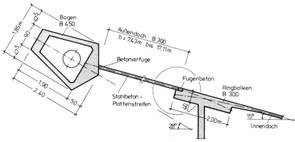 Der konstruktive Knackpunkt (links): Querschnitt durch Bogenträger, Außendach, Wand des Auditoriums und Innendach Detail der Bruchstelle: Durch Auf- und Abbewegung des Außendaches bekommt der Fugenverguss Risse, Wasser dringt ein, die Spannstähle korrodieren und reißen |