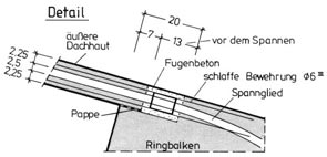 Durch Wind- und Schneelasten, durch temperaturbedingtes Anspannen und Erschlaffen der Bewehrung hob und senkte sich das angehängte Außendach – bis die Spannstähle zwischen Innen- und Außendach rissen, nach und nach und mehr und mehr, bis das tonnenschwere Vordach schließlich herabstürzte. |